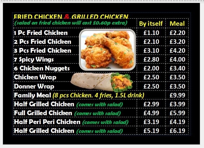 Lamb chops, chicken wings, seekh kebab, lamb amp chicken tikka, lamb amp chicken donner, 2 naan amp pilau rice. Suitable for 3 people.